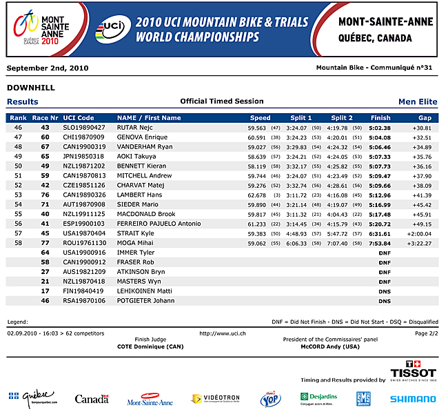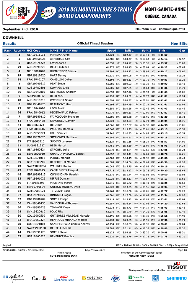 Partimos con esta tremenda foto!!! (gracias VitalMTB, vale la pena visitar ese sitio) Ayer fueron los entrenamientos cronometrados en el 3er dÃa de los World Champs en MSA. La verdad que sin sorpresas, ya que Greg Minnaar, Gee Atherton y Aaron Gwin fueron los mas rápidos. El único que sorprendió a mi gusto fue Mitch agarrate a combos con los Chilenos Delf, en un cuarto puesto. En tanto nuestro amigo Kike Genova se ubico en el lugar 47! Esperemos que pueda superar esta marca y ser ojalá el más rápido Sudamericano. Para saber el resto de los resultados y ver un par de videos de esta sesión (gracias DirtTV y MTBCut).. pásele.!