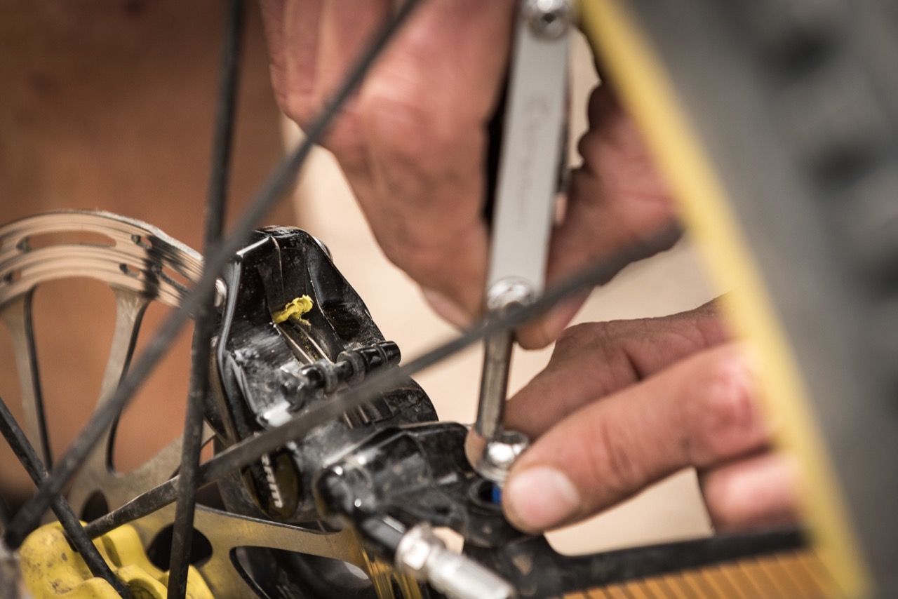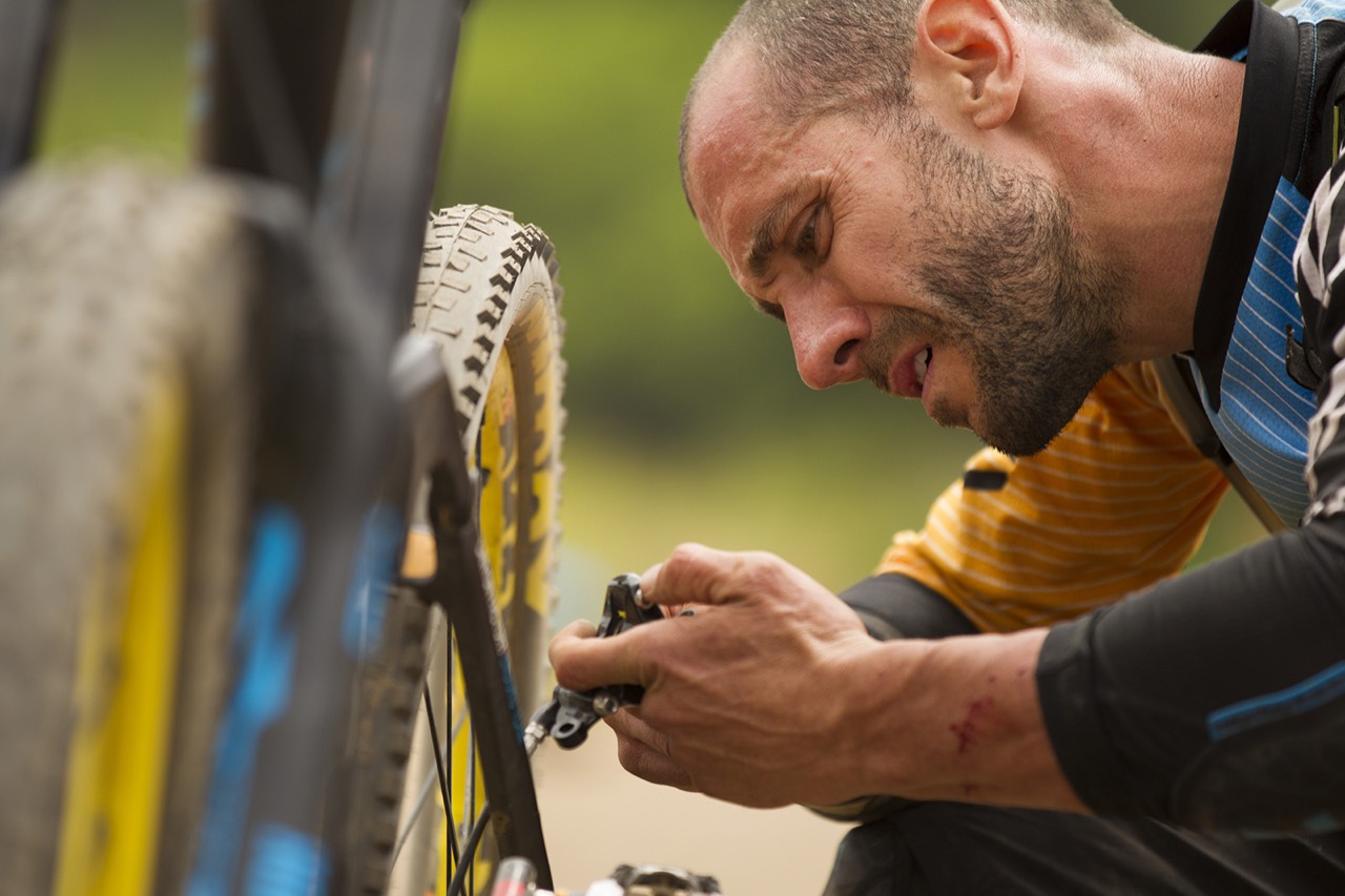 14 February 2015 – Fabien Barel inspects his brakes after he got some course tape wrapped around his wheel during Day 4 of the 2015 Andes Pacifico Enduro stage race near Matanzas, Chile. Photo by Gary Perkin