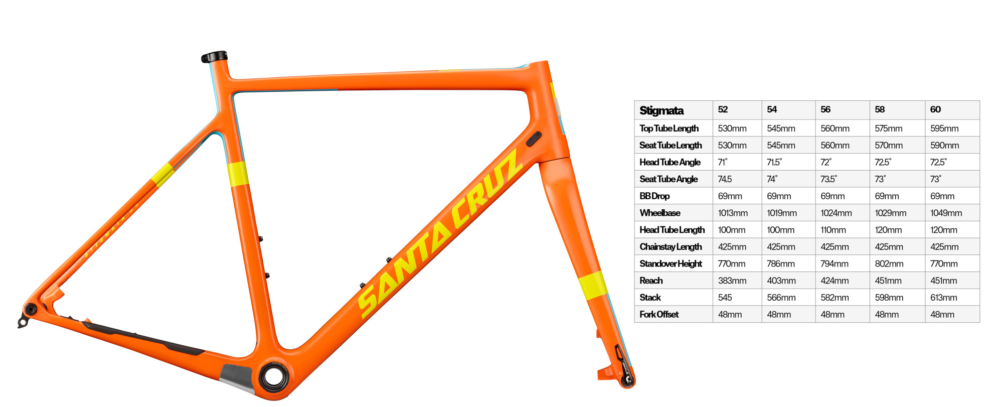 La Stigmata prescinde de soportes para frenos convencionales tipo cantilever y apuesta por los frenos de disco que tan bien funcionan y tantos detractores tienen, por ahora. Lo mismo nos pasó en los discos en las mountain bikes. Somos un mercado clásico y tradicional como los pantalones de pana y todo lleva su tiempo. Tampoco esperes roscas para guardabarros o portabultos. Tienes 3 montajes disponibles; Rival, CX1 y RED. Todo SRAM. Su quieres Shimano, te tendrás que montar tu propio cuadro. En dos colores Gloss Orange/Yellow y Matte Carbon/White. El precio del cuadro suelto es de 2.378 euros. El resto de precios, los tienes en el PDF adjunto al final. Toda la info de los montajes y configurador online en la web de Santa.