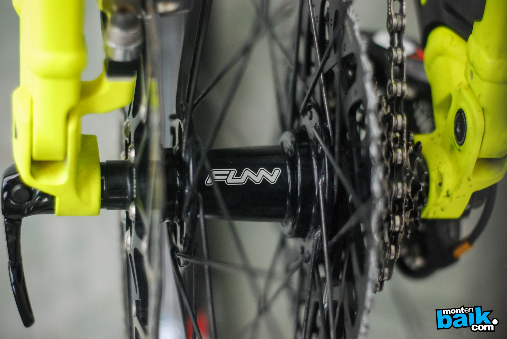 Atrás, Pedro nos cuenta que usa Vigilante que le da harto grip, pero para carreras usa el WTB Trailboss que es más rápido y requiere un manejo más fino. Los dos neumáticos los usa tubulares. La rueda Trasera es una Masa Funn con llanta WTB Frequency I25
