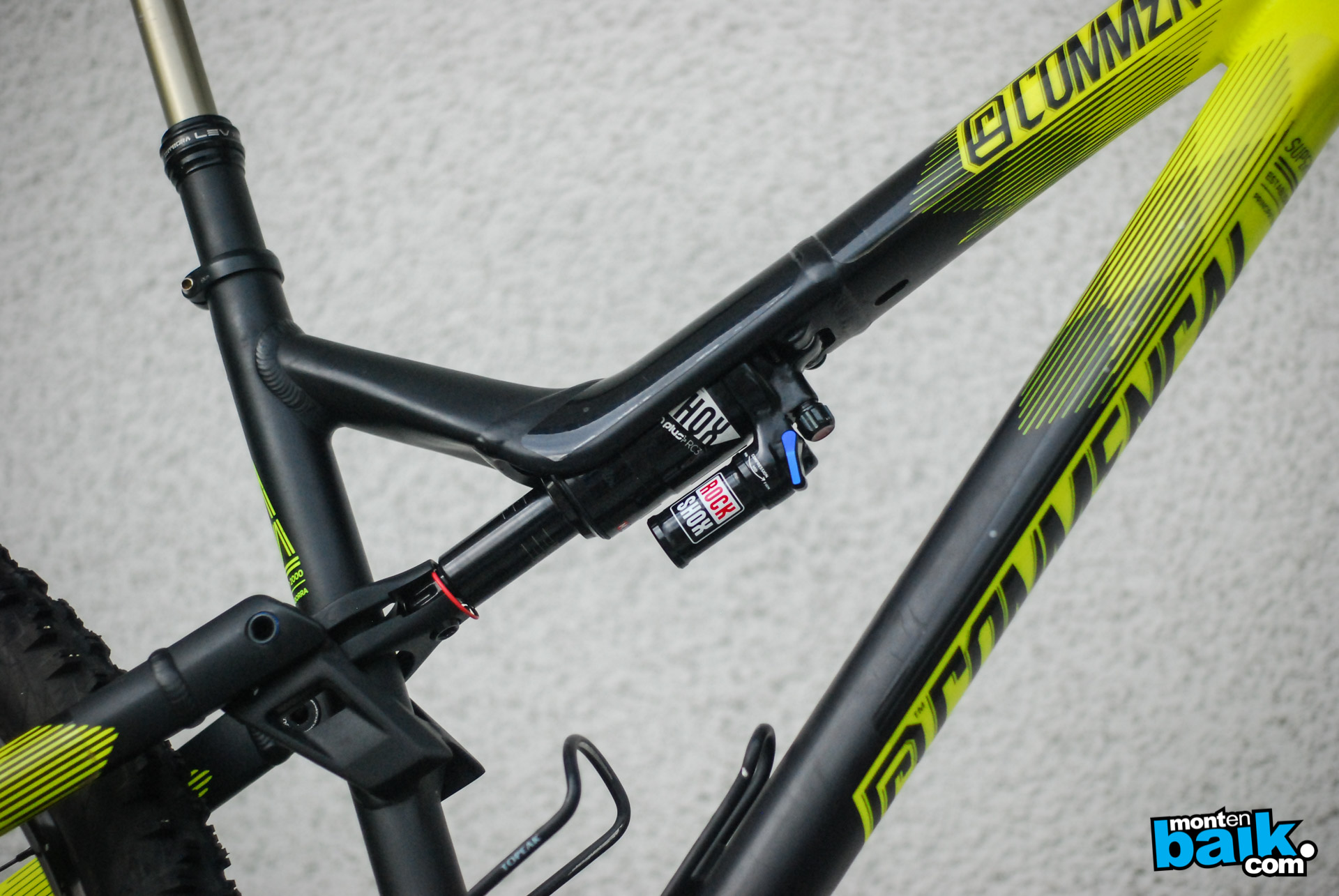 Esta Meta viene de fabrica con el Shock Rock Shox Monarch Plus Debonair el cual Pedro nos cuenta que lo usa con un 45% de Sag ya que le gusta andar con la bici bien blanda para que se sienta como de DH. Al preguntarle si le hace mucho fondo, nos dice que bien poco, con suerte una vez por especial.