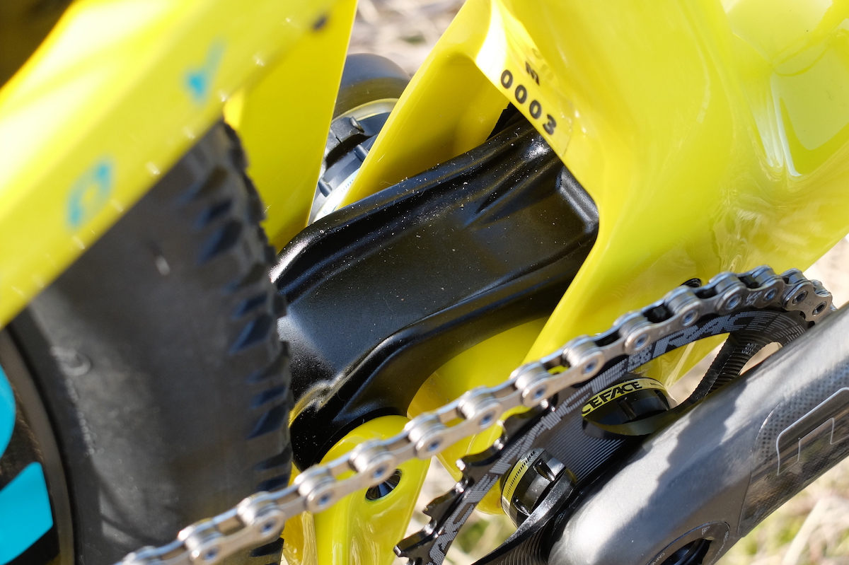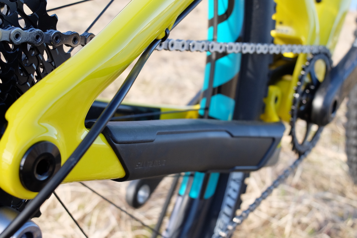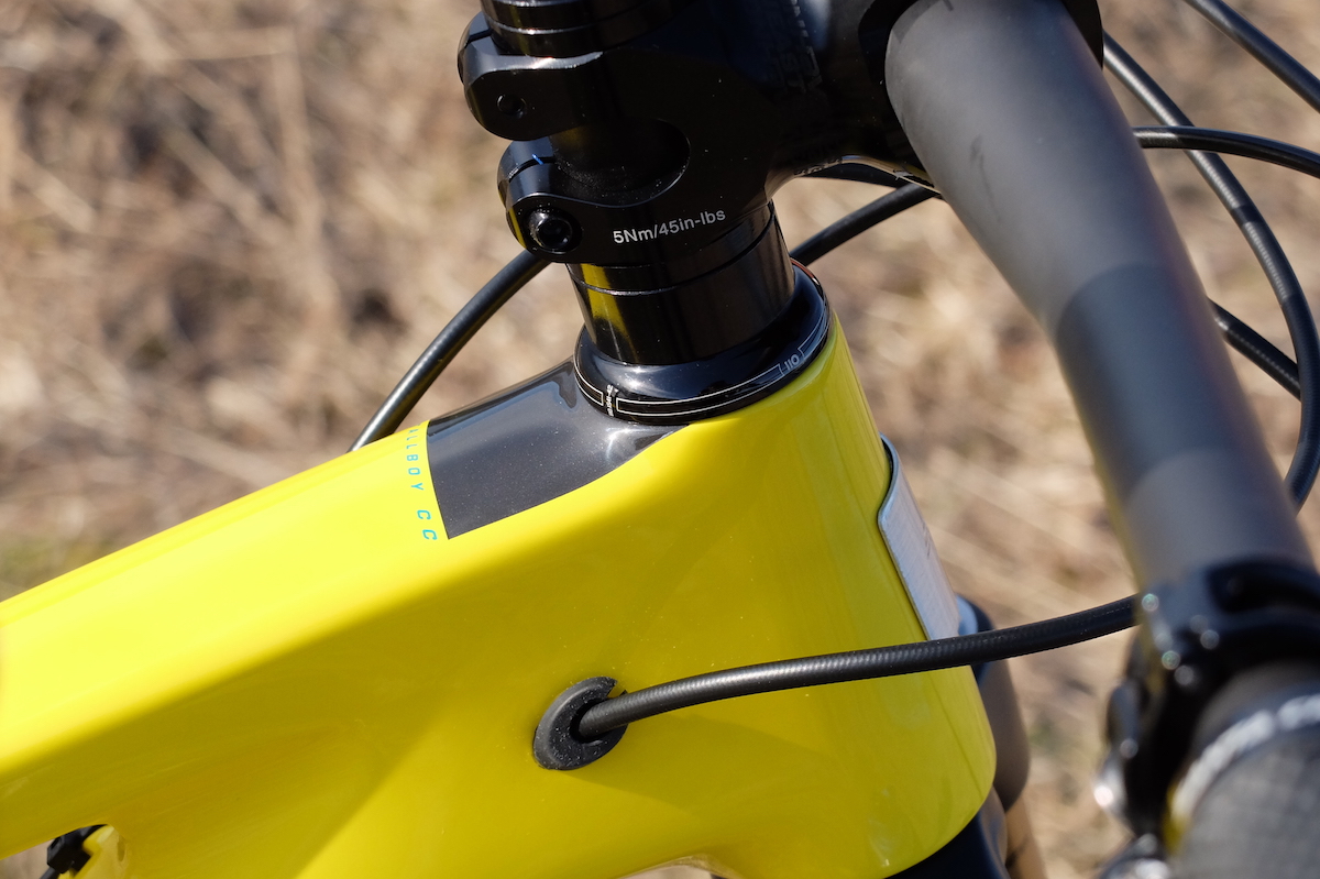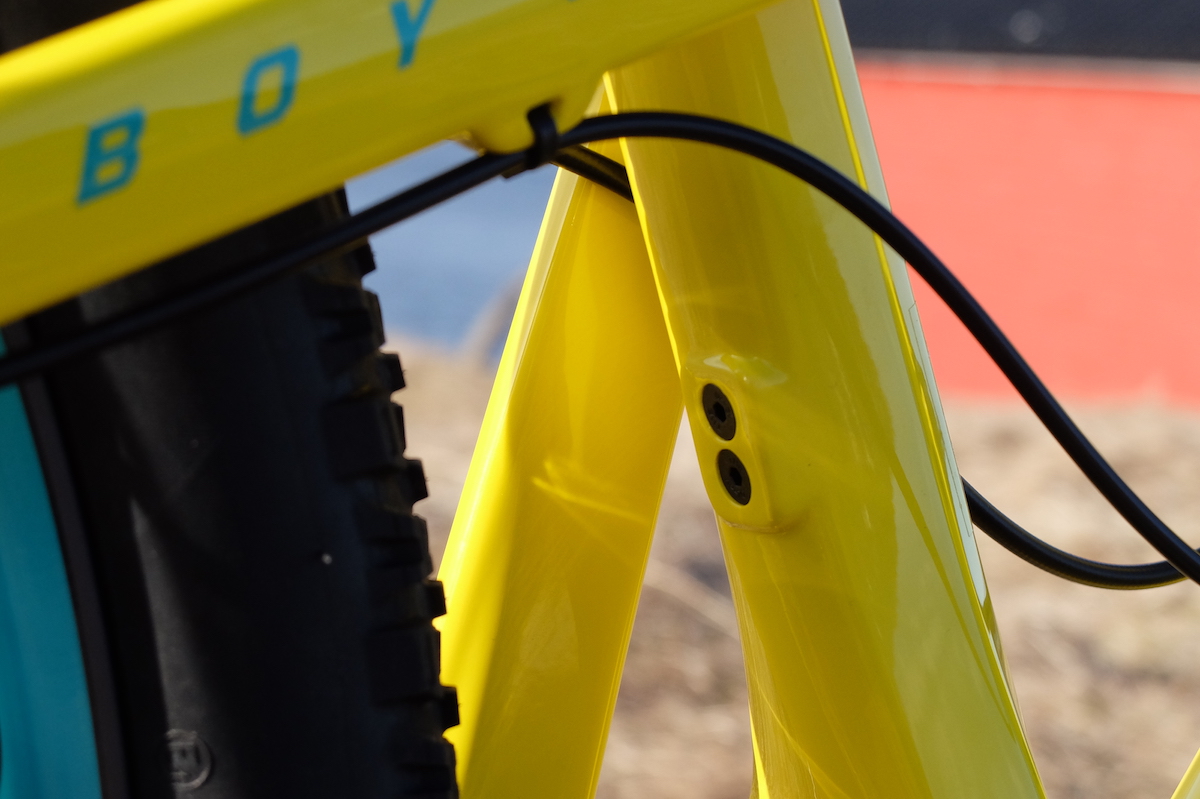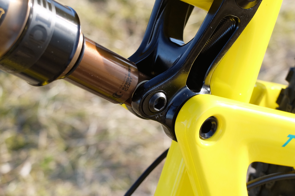 Y es que la evolución de la Tallboy se mide sobre todo por la posibilidad de montar 2 tipos de rueda diferente. Si, la Tallboy 3 permite montar ruedas de 29″ con horquilla de 120mm o ruedas plus, con horquilla de 130mm. Esto ya lo vimos en la Hightower y para permitirlo y que la geometría no se vea muy afectada, hay que girar un pequeño chip, en la bieleta superior donde se ancla el amortiguador. Lo podéis ver en una foto inferior. Además y para equilibrar este comportamiento más trail que ahora ofrece la Tallboy (olvidaros de la poca esencia cross country que le quedaba) ahora cuenta con 110mm de recorrido trasero. 10mm más que en sus versiones anteriores.