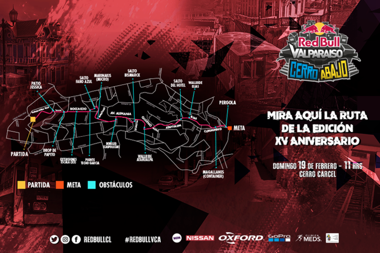 La decimoquinta versión del Red Bull Valparaíso Cerro Abajo, estuvo marcada por un desafiante recorrido, que se inició en lo alto del Cerro Alegre, pasando por lugares icónicos como la escala Bocaccio, Plaza Bismarck, calle Atahualpa y terminando en la clásica meta ubicada en plaza Aníbal Pinto.
