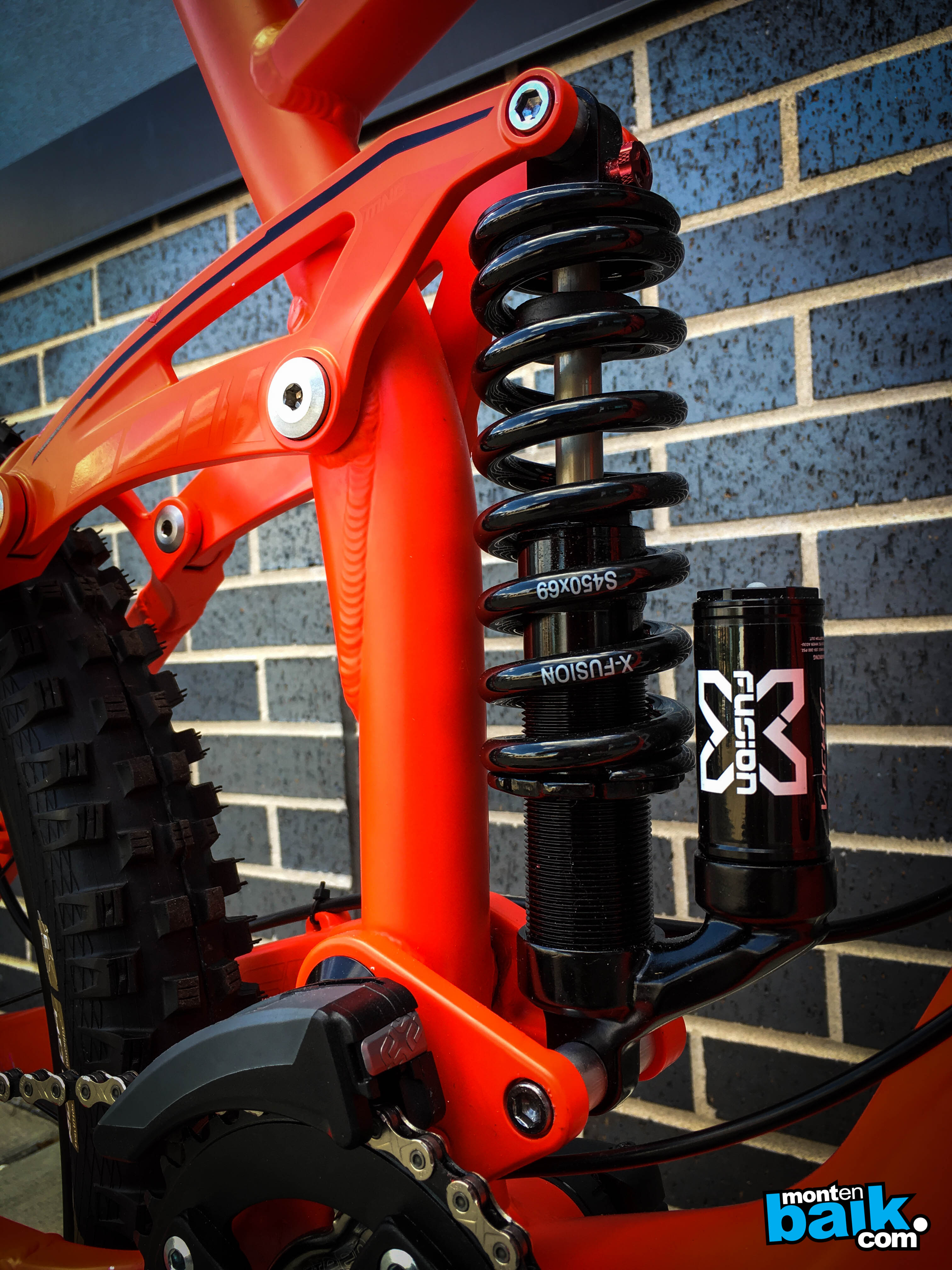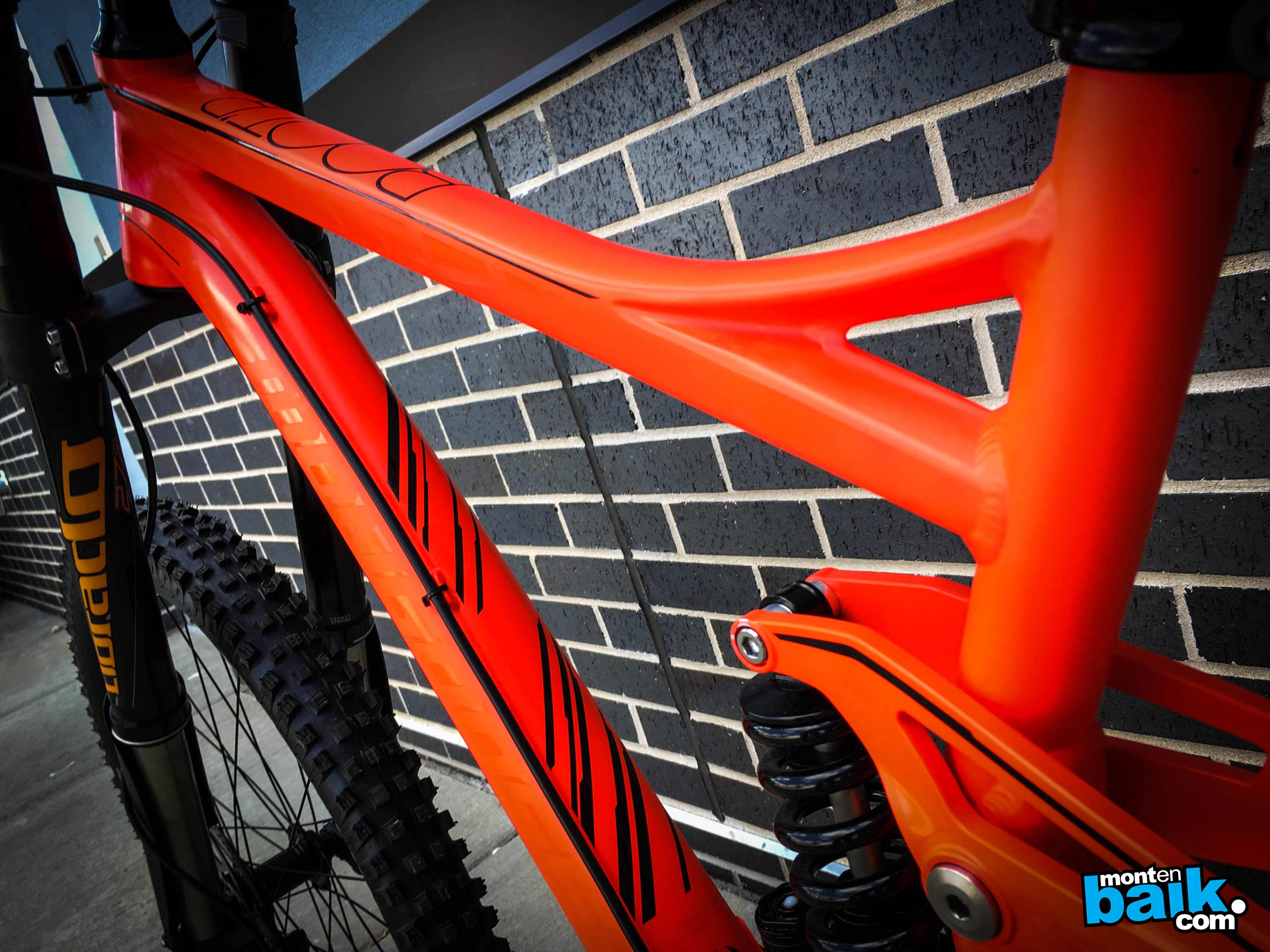 El color es un naranjo fluor, que en la foto no se aprecia mucho, pero la verdad que esta bien rico y la bici se ve a fondo.