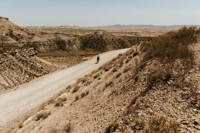 Llegué al pueblo y me topé con la dupla de la noche anterior desayunando. Me dijeron que habían dormido en el “frontón” del pueblo con otros 6 riders. Desayunamos, cargamos agua y a la ruta. Salimos de ahí y nos juntamos con la dupla y con otro rider (el francés de la MTB del primer día) venía un puerto durísimo llamado Izko que subía a un parque eólico. El calor empezaba a mostrarse y empezábamos a subir. La dupla paró en una zona y seguimos con el francés en un mano a mano en el puerto. No aflojaba y nos adelantábamos mutuamente hasta que en un caracol miré y venia caminando (te gané, pensé) seguí hasta arriba y paré en la cima. El camino siguió en un sube y baja y no vi mas al francés ni a la dupla, almorcé solo en un pueblo con mucha calma y comí muy bien. Venía una zona que no tenía prevista que era la antesala a Bardenas Reales. Una zona muy árida y con muchas subidas. Al final se veía un pueblo en altura con un torreón medieval espectacular. El camino era puro Gravel y cada vez mas malo. Vi unos riders a lo lejos y traté de pillarlos pero el sol estaba bravísimo. En la última remontada tuve que parar varias veces y me pilló la dupla y otro rider (Fernando) que me dio mucho ánimo (muy buena onda) ¡vamos! me dijo y le seguí la rueda hasta llegar arriba. Al entrar al pueblo vi al francés que estaba tirándose bajo un árbol a dormir para pasar el calor. Llegamos y “asaltamos” el bar (en los bares nos miraban como extraterrestres pero nos trataban muy bien). Estaba “el cámara” de la organización y nos filmó y entrevistó brevemente. Fui el último en salir de ahí, posiblemente porque era el que estaba mas afectado por el calor. Vi el track y venía una larga bajada y empezaba el “llano” de Bardenas Reales. Empecé a bajar y me equivoqué en un cruce. Me di cuenta unos 30 segundos después del error pero venia tan rápido y la bajada era tan empinada que me demoré unos 15 a 20 minutos corregir el error.